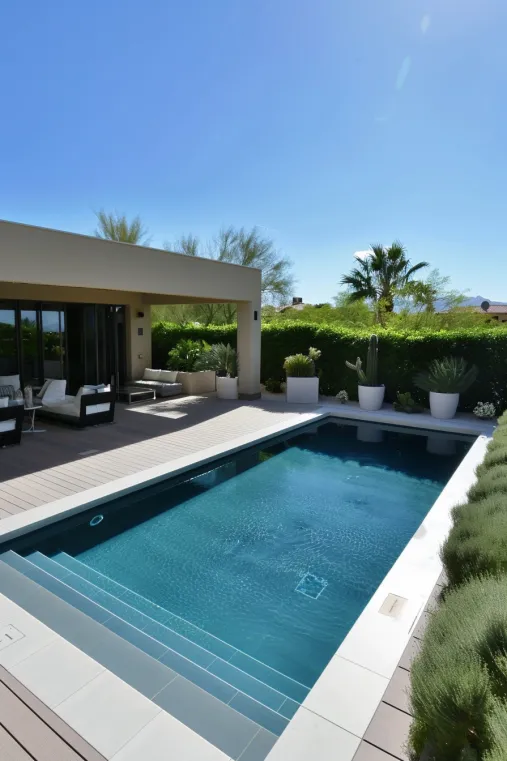 This minimalist pool design is the perfect blend of elegance and simplicity. The pool itself is sleek and narrow, nestled perfectly beside a modern patio area. Large, potted plants frame the space, adding a touch of greenery while keeping the overall design clean and uncluttered. The simple stone tiles around the pool add texture and warmth, creating a peaceful, intimate atmosphere perfect for relaxation.
