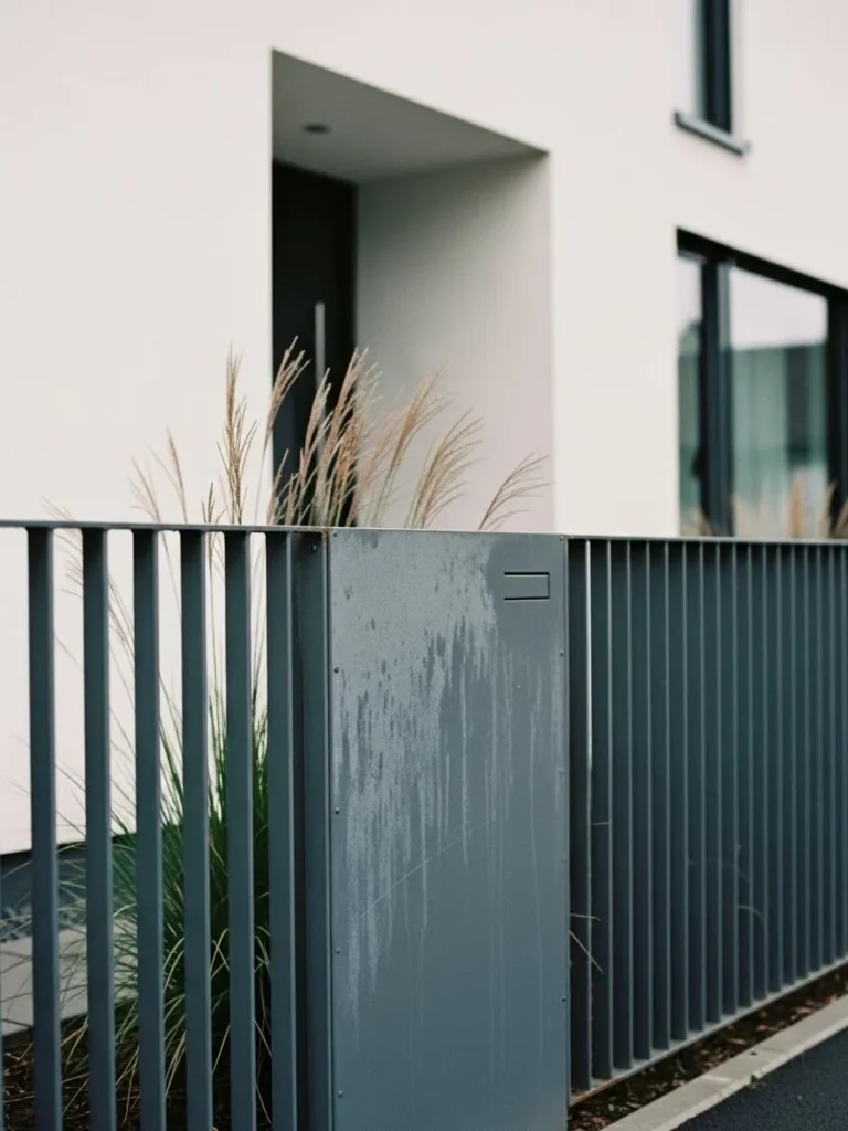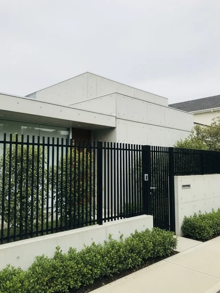 This design features ultra modern vertical steel slats in a deep charcoal grey that perfectly complement the crisp white architecture of the home. The clean lines of the metalwork create a sophisticated boundary while the integrated solid panel acts as both a structural anchor and a clever spot for a built in mailbox. It is a minimalist masterpiece that uses repetition and shadows to add texture without any unnecessary clutter.