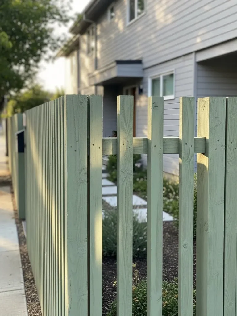 I absolutely adore this color choice because it feels like a big warm hug for your curb appeal. Sage is such a trendy yet timeless neutral right now and it blends so seamlessly with the actual plants in the yard. It feels creative and personal without being too over the top or loud. To me, this is the perfect solution for anyone who wants a bit of privacy and structure but still wants their home to feel breezy and connected to nature.