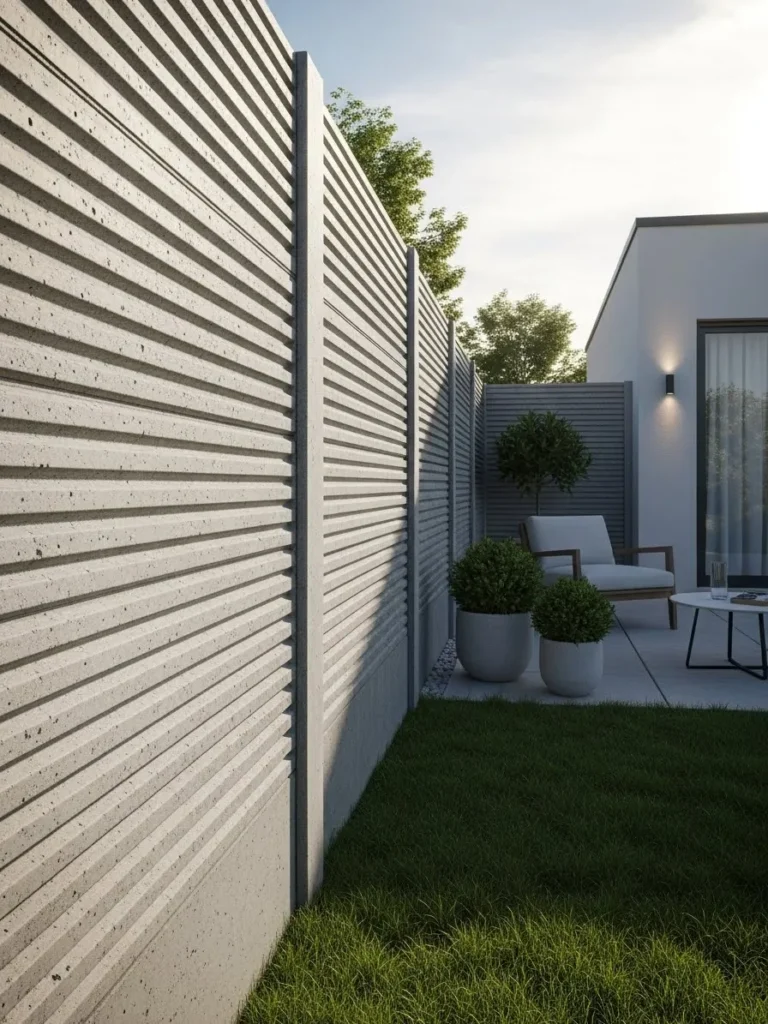 This striking boundary uses horizontal grooves etched into light grey concrete panels to create a textured industrial look that still feels totally refined. The panels are held in place by sturdy vertical pillars that give the whole structure a sense of permanence and strength. It pairs beautifully with the minimalist white architecture and clean patio tiles shown in the background. The solid height provides complete privacy for your outdoor lounge area while the ribbed pattern prevents the wall from looking too heavy or flat.