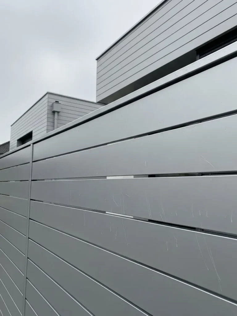 This fence features wide horizontal aluminum slats in a stunning metallic silver finish that perfectly matches the modern architecture of the home. The gaps between the slats are very narrow which offers a high degree of privacy while maintaining a sleek linear look. The material is incredibly durable and weather resistant making it a smart choice for any climate. The cool grey tones of the metal create a monochromatic and unified look when paired with similar grey siding or trim.