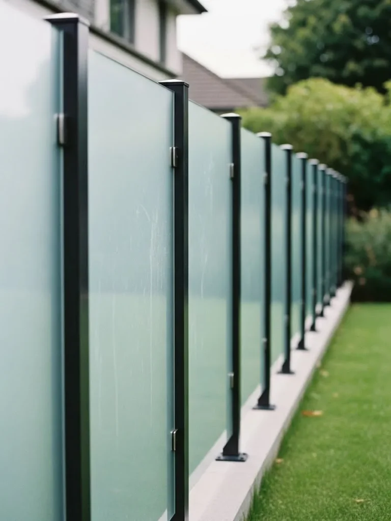 This design uses large sheets of frosted glass held in place by slim matte black aluminum posts to create a boundary that feels light and airy. The translucent glass provides an excellent level of privacy by blurring shapes and movement while still allowing soft filtered light to pass through to the lawn. It sits on a low concrete base which gives the whole structure a very grounded and high end look. This is a brilliant option for smaller yards where a solid wall might feel too cramped or dark.