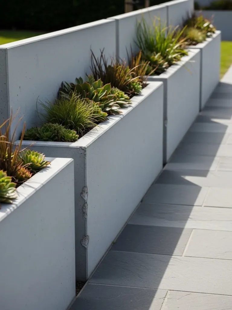 This design is the ultimate dream for anyone who loves a crisp and ultra modern aesthetic. It uses smooth light gray concrete modules that serve a dual purpose as both a boundary marker and a functional garden bed. The clean geometric lines and stone gray finish create a neutral backdrop that makes the green succulents and ornamental grasses really pop. It is a low profile look that defines the edge of a patio or walkway without feeling heavy or closed off from the rest of the world.