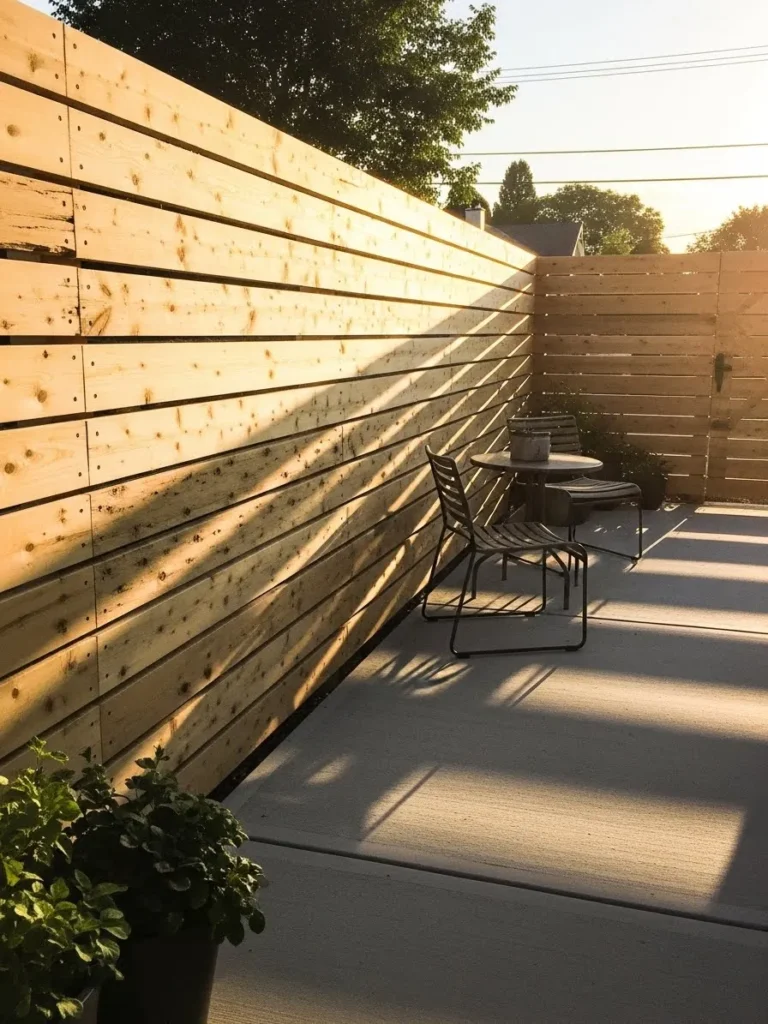 This stunning design features clean horizontal wood planks that create a sleek and uninterrupted flow around the patio. The light natural finish of the cedar or pine allows the organic grain and knots to peek through, adding a touch of rustic charm to an otherwise very minimalist structure. By leaving small, uniform gaps between the boards, the fence provides plenty of privacy while still letting soft light and a gentle breeze filter through. It pairs perfectly with the smooth concrete flooring and simple black metal furniture to create a contemporary outdoor oasis that feels both open and tucked away.