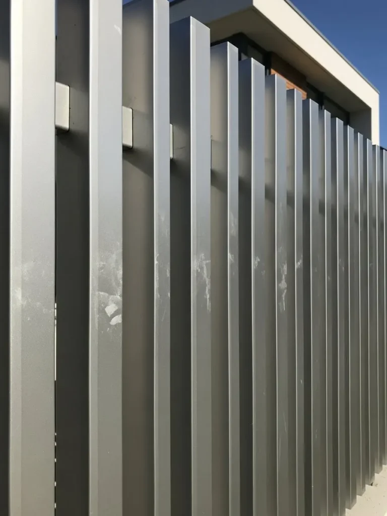 This modern setup features thick vertical aluminum blades finished in a stunning matte silver metallic sheen. The deep profile of each blade creates a rhythmic sense of depth and shadow that changes depending on where you stand on the sidewalk. It is a fantastic choice for contemporary homes that lean into industrial materials while keeping a very polished and high end appearance. The gaps are narrow enough to offer a sense of security without feeling like you are completely walled off from the world.