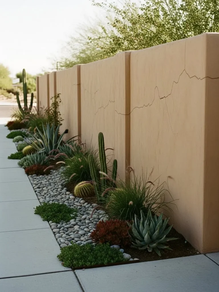 This look is all about that stunning Mediterranean or Southwestern flair with a smooth sand colored stucco wall. The solid surface provides a perfect backdrop for a low maintenance garden filled with sculptural cacti and soft ornamental grasses. Instead of a traditional picket fence this design uses thick continuous sections that create a peaceful and quiet sanctuary inside. The neutral earthy tone of the wall pairs perfectly with the grey river rocks and green succulents for a look that is totally sophisticated and effortless.