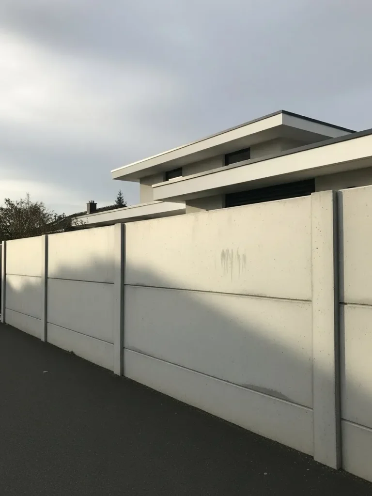 This ultra modern look features solid concrete panels held together by sturdy vertical pillars to create a smooth and seamless boundary. The light gray finish of the stone perfectly mirrors the sharp lines and flat roof of the contemporary house behind it. It offers total privacy and a very quiet atmosphere since the thick material helps block out street noise. There is a subtle horizontal groove running across the middle of each section which adds just enough detail to keep the large surface from feeling too heavy or overwhelming. It is a bold architectural choice that turns a simple perimeter into a striking design statement.
