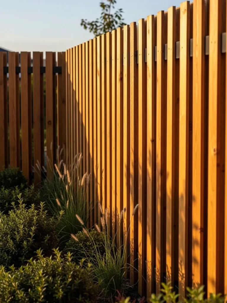 This design features a stunning series of vertical cedar timber battens that create a rhythmic and sophisticated boundary for any modern property. The slats are spaced perfectly to allow light and air to flow through while still maintaining a sense of privacy and enclosure. Each piece of wood is stained in a warm honey hue that glows beautifully during the golden hour and highlights the natural grain of the timber. The clean lines of the vertical boards are supported by a sleek dark metal frame that stays tucked away so the focus remains entirely on the wood.