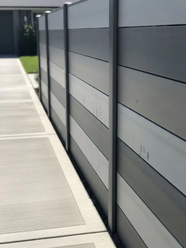 This design showcases a ultra modern take on privacy with thick horizontal panels finished in a beautiful gradient of charcoal and dove grey. The smooth matte surface of the boards creates a very polished look that pairs perfectly with a crisp concrete driveway or a contemporary walkway. Sturdy metal posts frame each section to provide a structured and architectural feel while keeping the overall profile slim and tidy. It is a fantastic choice for anyone looking to achieve a seamless and high tech appearance for their property.