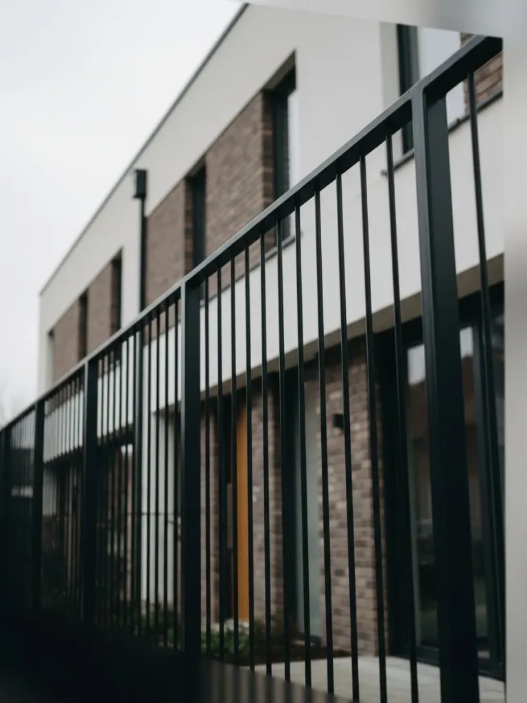 This design features ultra thin vertical iron pickets finished in a deep matte black that looks incredibly sharp against a modern brick and white plaster exterior. The slats are spaced perfectly to create a rhythm that feels secure but doesn’t block the view of the architecture behind it. By ditching the chunky traditional rails and going for a clean flat top bar, the whole look stays airy and sophisticated. It is the ultimate choice for a contemporary townhouse or an urban home where you want to define your boundary without closing yourself off from the neighborhood.