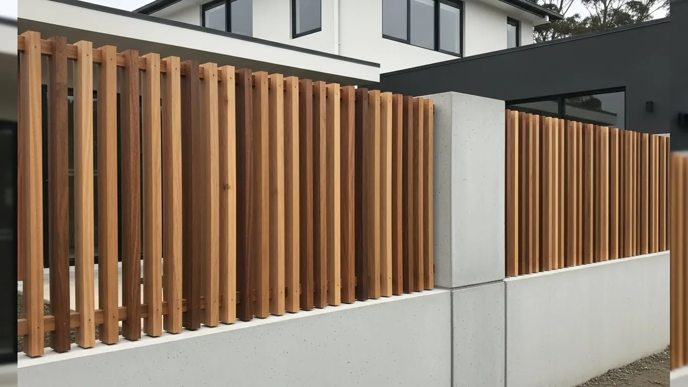 This design features a stunning contrast between thick natural wood vertical slats and a smooth industrial concrete base. The warm oak tones of the timber posts are mounted onto a sleek black metal frame which keeps the look structured and airy. Because the slats are spaced out you get a sense of privacy without feeling completely closed off from the world. It perfectly complements the minimalist white architecture of the home by adding a touch of organic texture to the clean sharp lines of the building.