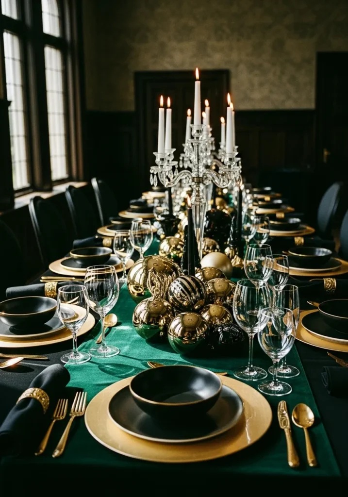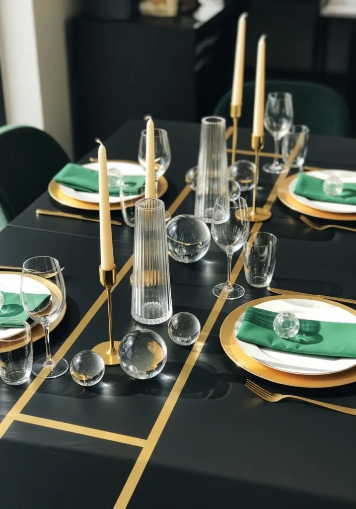 This table is all about contrast and symmetry. The black tablecloth with golden grid lines feels bold and architectural, while emerald napkins bring just the right amount of festive flair. The clear glass spheres scattered along the table reflect light beautifully, creating an almost jewelry-like sparkle.