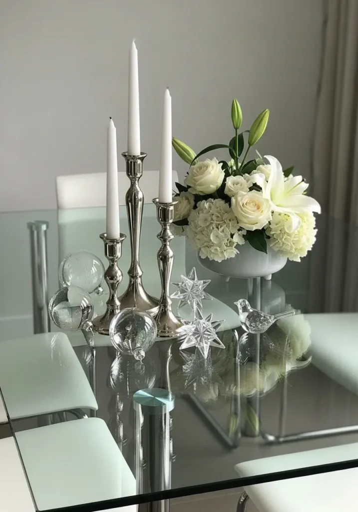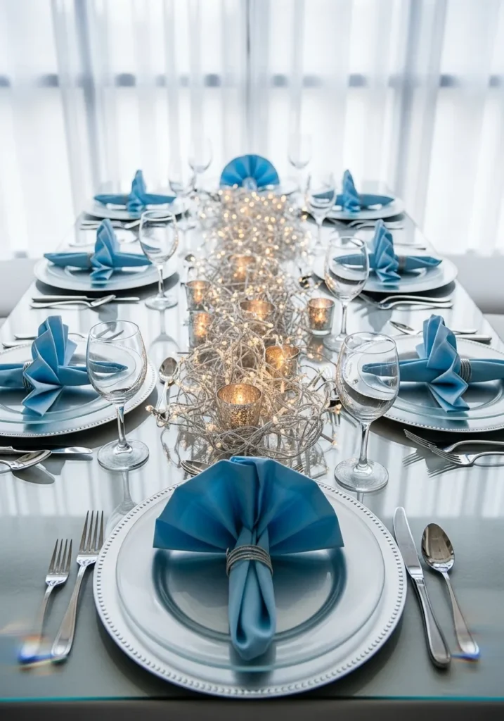 This modern glam table sparkles with crisp silver, cool blue napkins, and a glittering centerpiece made of twinkling lights and metallic accents. The mirrored tabletop reflects every shimmer, giving the entire setup a frosty, elegant glow that feels like a chic winter wonderland.