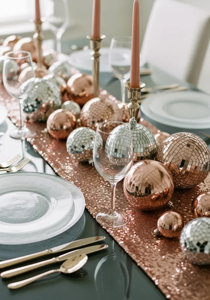 This festive table brings the party energy with sparkling rose gold and silver disco ball ornaments scattered across a glittering runner. Soft pink candles add warmth, while metallic details keep things vibrant and joyful. The clear plates and gold cutlery tie the look together for a modern yet playful aesthetic.