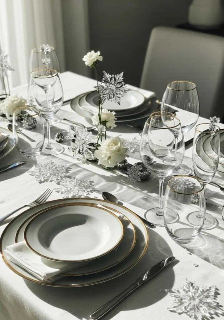 This design blends crisp white with glimmers of silver and gold, creating a look that’s both minimal and magical. Gold-rimmed plates and glassware sit elegantly among crystal snowflakes and white florals. The light catches just enough sparkle to make the whole table twinkle like fresh snow.
