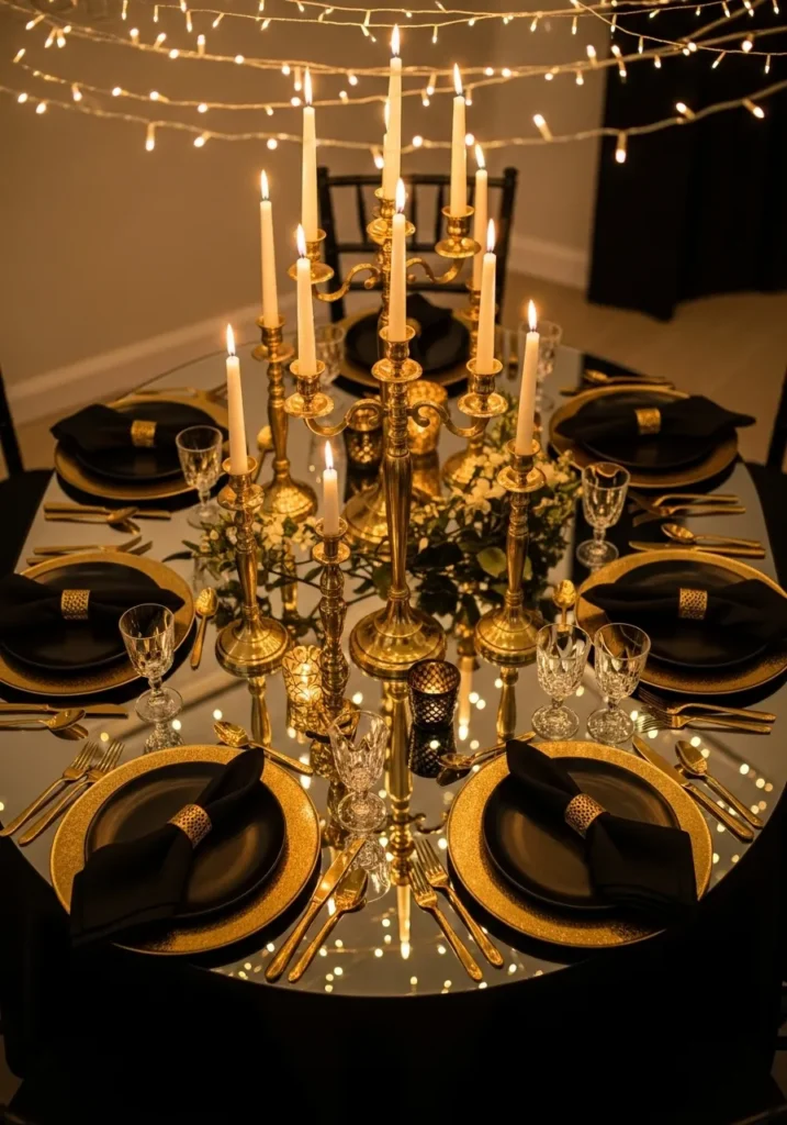 This table glows like pure magic with layers of golden candleholders, mirrored surfaces, and twinkling string lights above. The black plates and napkins make the gold accents pop, creating a dramatic and ultra-luxurious vibe. The soft reflections from the candles give everything a warm, romantic radiance that feels straight out of a holiday dream.