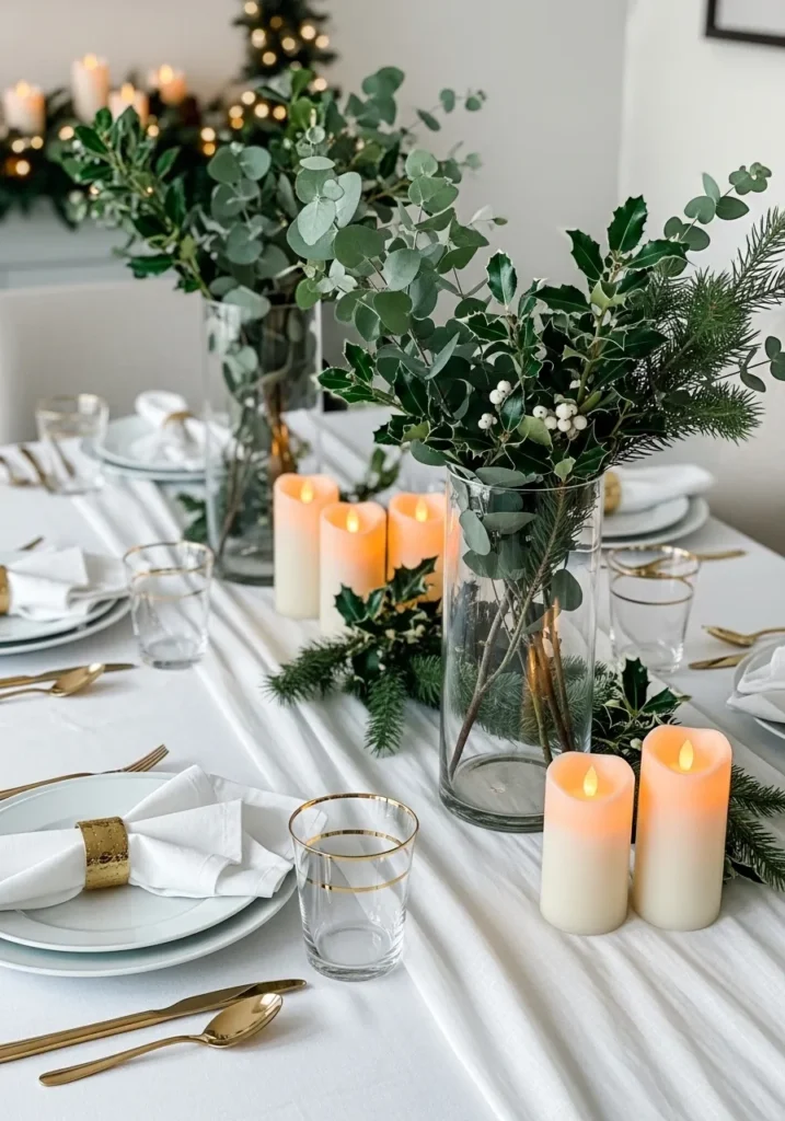 Soft candlelight and fresh greenery come together beautifully in this elegant yet relaxed setup. The gold-rimmed glasses and candleholders add just enough sparkle to keep things feeling festive, while the eucalyptus and holly branches bring in a natural, organic touch.