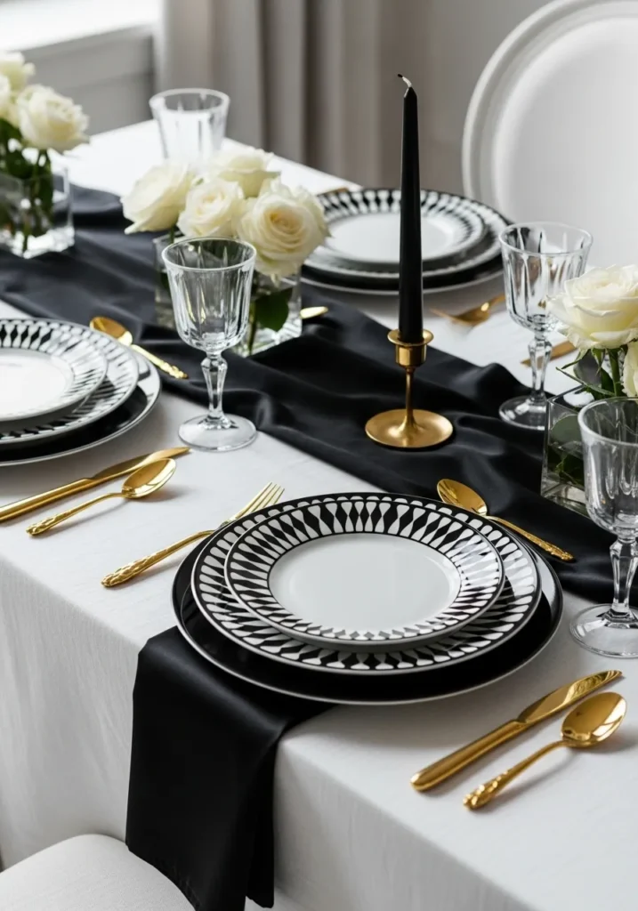 Bold black-and-white patterned plates take center stage here, perfectly paired with gold flatware and sleek black candles. The contrast of monochrome against white linens gives it that timeless modern edge, while fresh white roses soften the overall look.