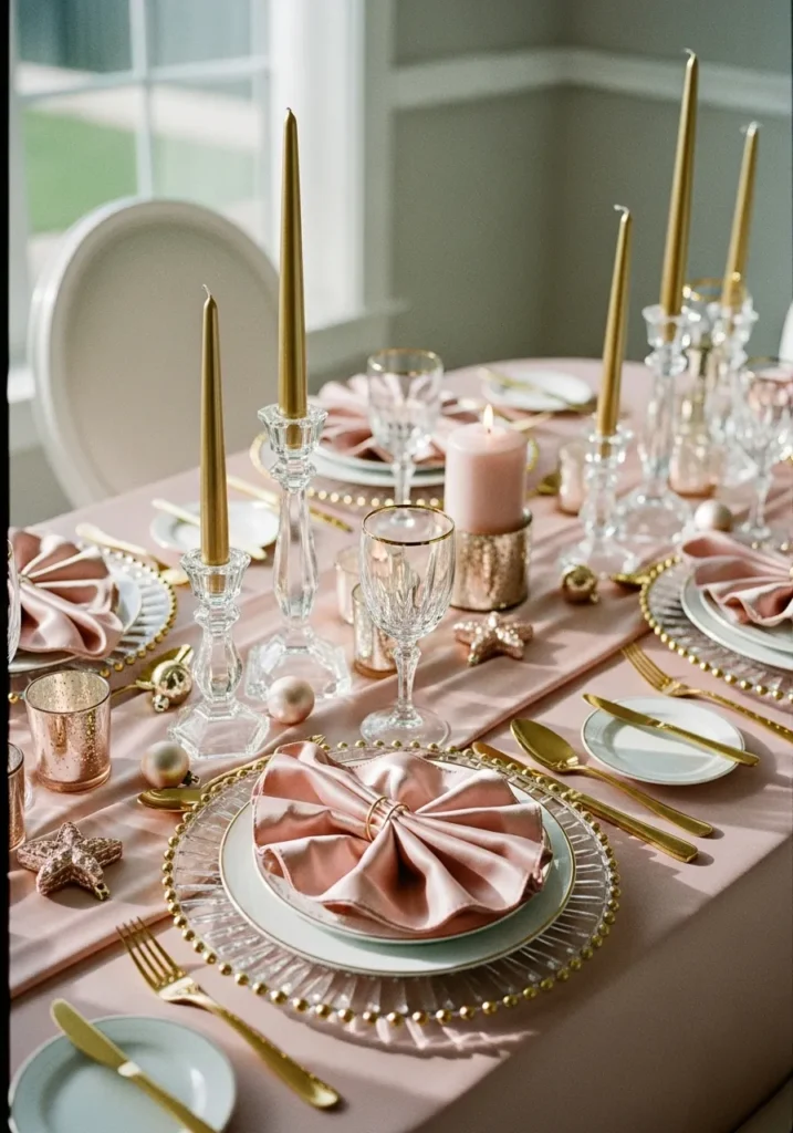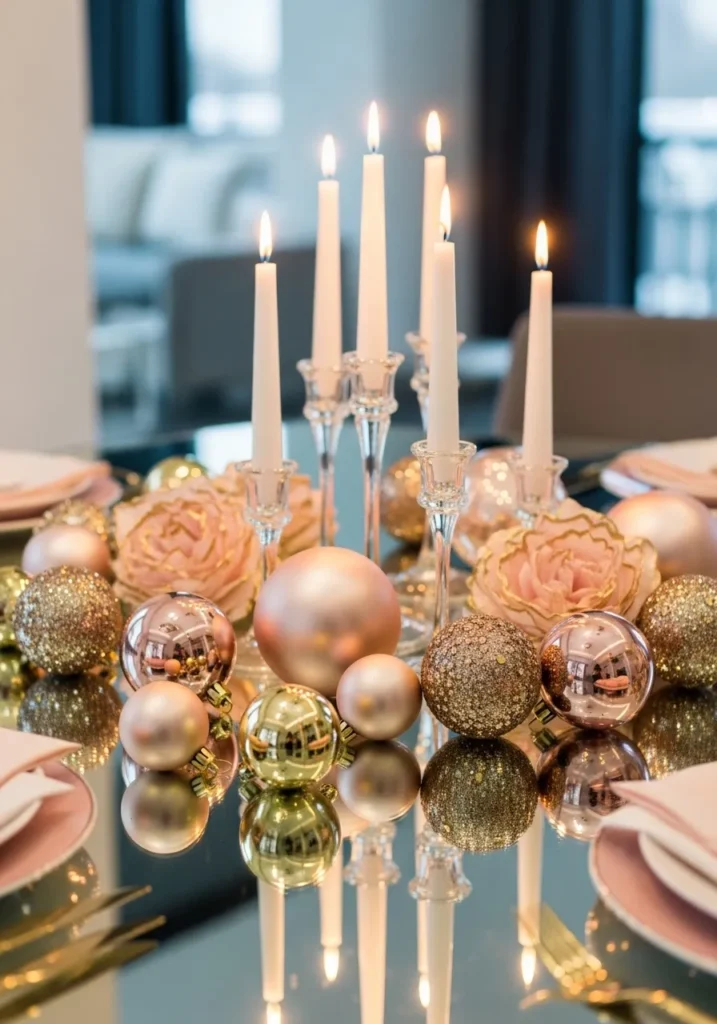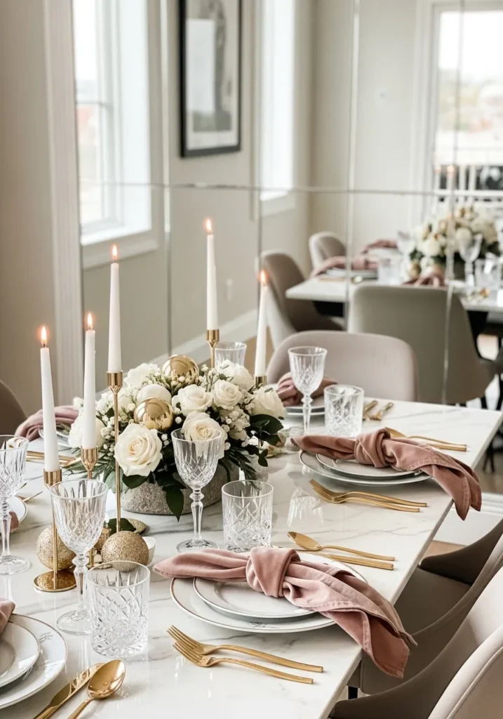 I think this might be one of the prettiest ways to do Christmas glam. The mix of gold and blush feels luxurious yet soft, and the reflections make the whole table look like it’s glowing from within.