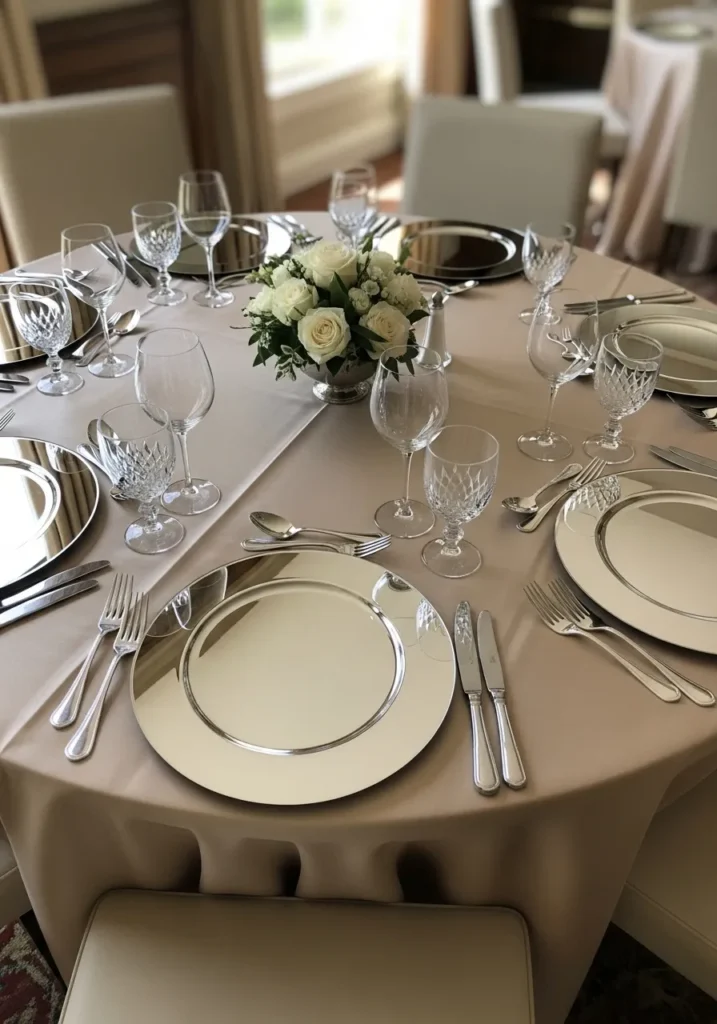 This setting is all about refined glamour. The mirrored charger plates, polished cutlery, and soft beige tones create a stunning balance between modern style and timeless sophistication. A simple white rose centerpiece adds a gentle romantic note without taking away from the sleek metallic shine.