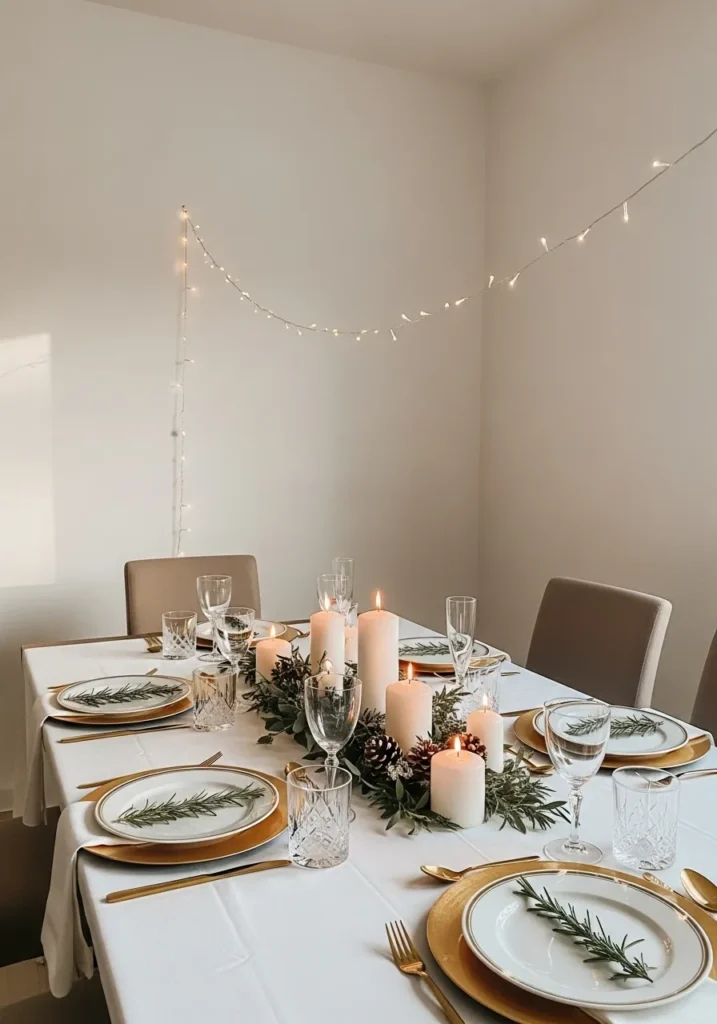 Soft candlelight, golden plates, and natural greenery come together in this cozy yet glamorous setup. The crisp white linens and clean lines keep everything feeling fresh, while the warm gold accents add a subtle festive glow. Sprigs of rosemary on each plate add a touch of organic charm that feels both elegant and personal.