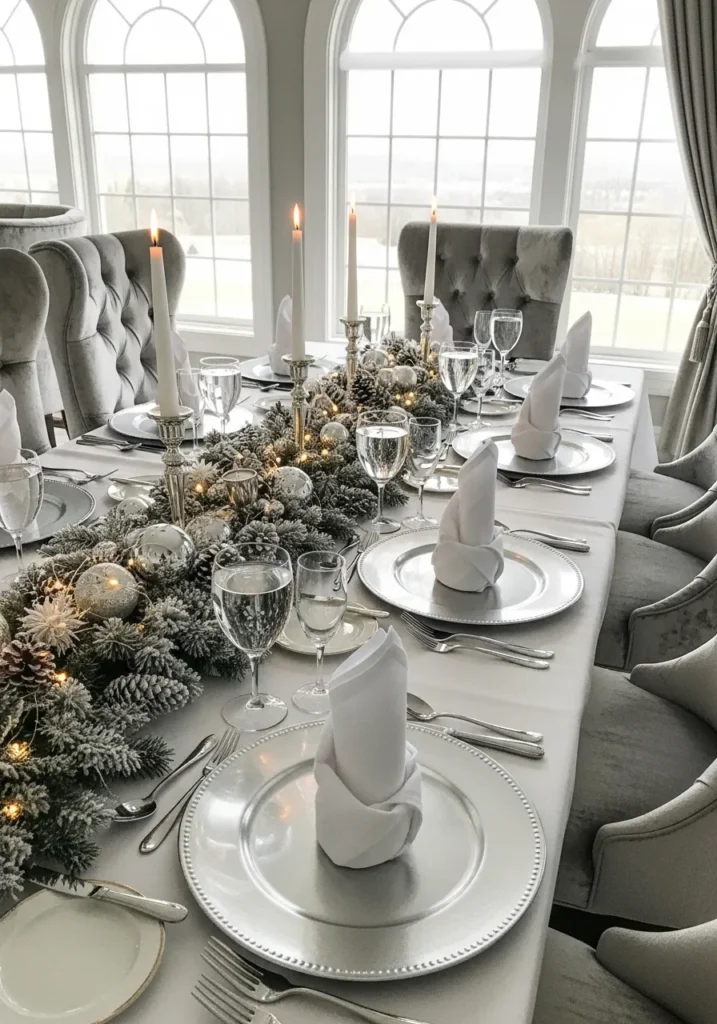 A snow-dusted garland of pinecones and ornaments runs through the center of this glamorous silver table. The monochrome color palette creates a sophisticated, wintery atmosphere that feels both luxurious and serene. Tall white candles and tufted velvet chairs complete the look with soft refinement.
