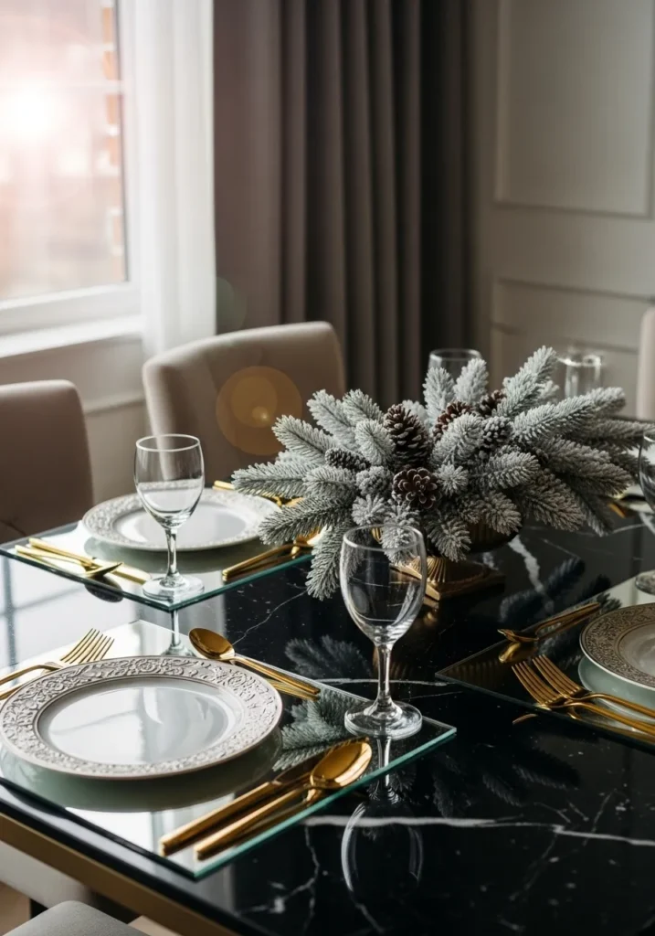 This table design combines glossy black marble with luxurious gold flatware, creating a stunning modern glam look. The mirrored placemats add a reflective glow, while the frosted pine centerpiece gives it that perfect Christmas touch without overwhelming the sleekness of the setup. Every element feels intentional, from the elegant glassware to the subtly textured dinner plates.