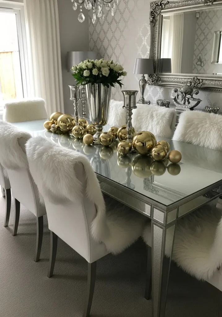 This glamorous table glows with silver accents, golden ornaments, and mirror reflections that make the whole space sparkle. Plush faux fur chair throws and a silver vase filled with roses add softness to the shine, making the setup feel cozy yet incredibly sophisticated. Every inch of this space says holiday luxury done right.