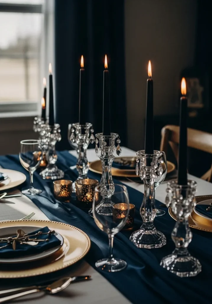 This dark and moody table setting feels rich and mysterious, with deep navy tones and tall black candles in crystal holders. The flickering candlelight dances across gold plates and delicate glassware, giving the whole setup a cinematic, romantic feel. The combination of navy and gold is bold yet endlessly chic.
