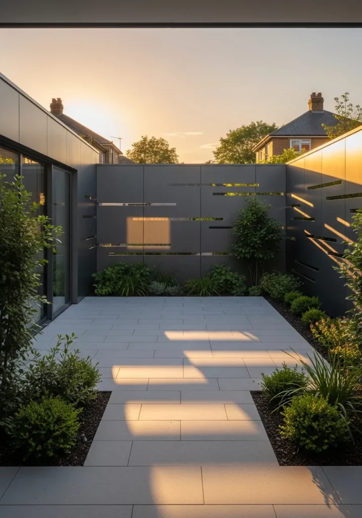 This outdoor courtyard is framed by a tall charcoal gray slatted privacy wall that feels sharp and architectural. The horizontal lines stretch cleanly across the space and instantly give it a modern edge. Large rectangular pavers in a soft beige tone keep the ground simple and elegant, while low greenery planted along the perimeter softens the bold structure. Subtle built in lighting at the base of the wall casts a warm glow across the tiles, creating a calm and intimate atmosphere as the sun sets.