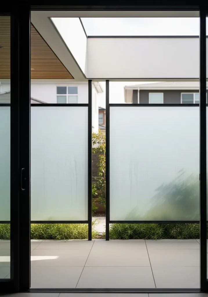 This privacy wall uses tall frosted glass panels framed in slim black metal to create a bright yet secluded outdoor corridor. The translucent glass allows soft light to pass through while blurring any view from the outside. The strong vertical lines of the frames contrast beautifully with the smooth flooring and the greenery planted along the base.