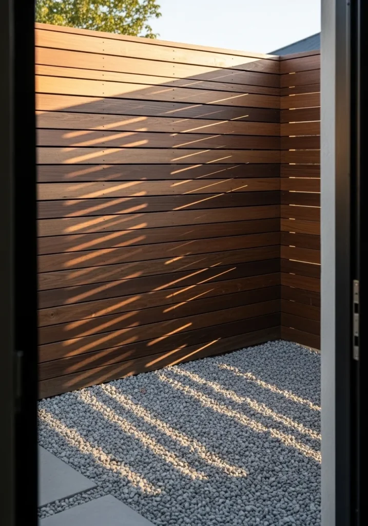 This design features a rich horizontal wood slat privacy wall wrapping around a small gravel courtyard. The warm timber boards are evenly spaced, creating rhythm and clean architectural lines. As sunlight hits the slats, striped shadows fall across the ground, adding depth and texture to the simple space. The tight corner layout makes the wall feel bold and intentional.