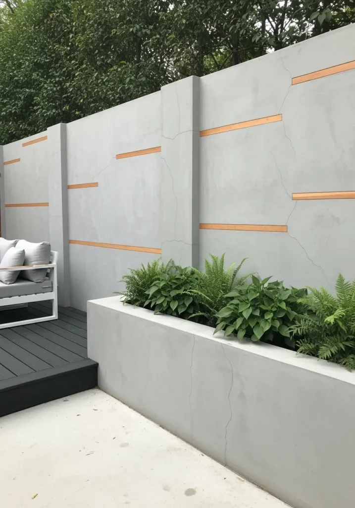 This backyard design showcases a smooth light gray concrete privacy wall detailed with thin horizontal wood insets. The wood strips add warmth and visual interest without interrupting the clean architectural flow. A built in raised planter filled with leafy greenery runs along the base, creating a layered and intentional look. Simple outdoor seating nearby keeps the focus on the wall’s structured elegance.
