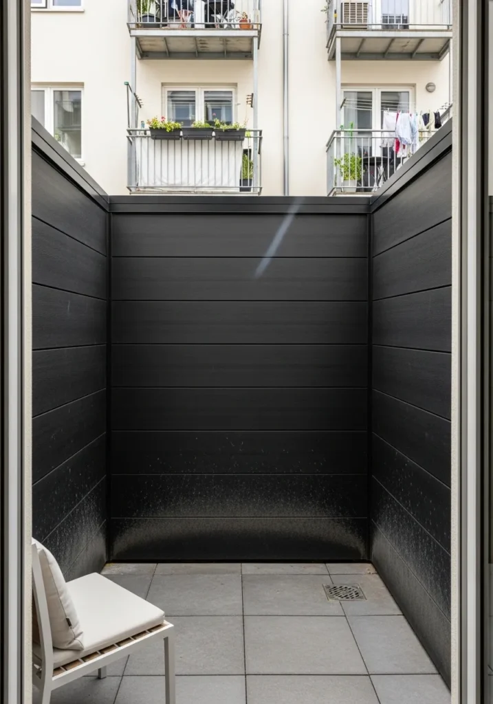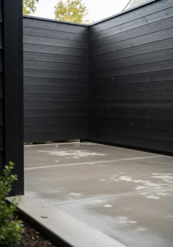 This narrow outdoor area is enclosed by tall matte black horizontal panels that emphasize strong linear structure. The consistent lines wrap around the corner seamlessly, creating a cohesive and grounded look. Smooth concrete flooring keeps the palette minimal and lets the wall take center stage. The height of the panels adds a sense of privacy while maintaining a sleek silhouette.