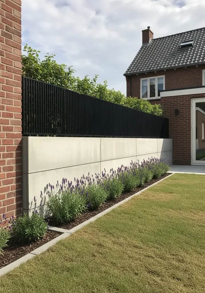 This design features a modern privacy wall combining a light lower section with a black vertical slat upper portion. The crisp division between the two materials creates a strong horizontal line that anchors the yard. A neat row of lavender and greenery planted along the base adds softness and color against the structured backdrop. The clean lawn and simple layout keep everything looking sharp and balanced.