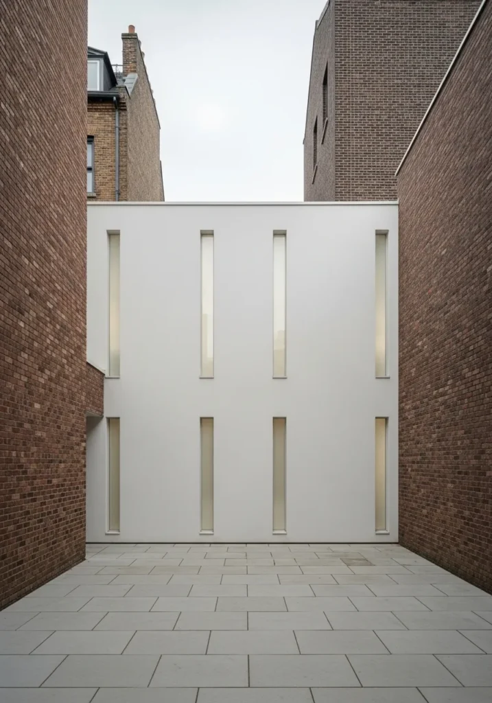 This striking design features a tall white privacy wall with slim vertical cut outs spaced evenly across the surface. The smooth finish and sharp edges highlight the minimalist geometry. Set between two brick buildings, the wall acts as a bright focal point at the end of a paved walkway. The narrow openings allow light to filter through while maintaining full privacy.