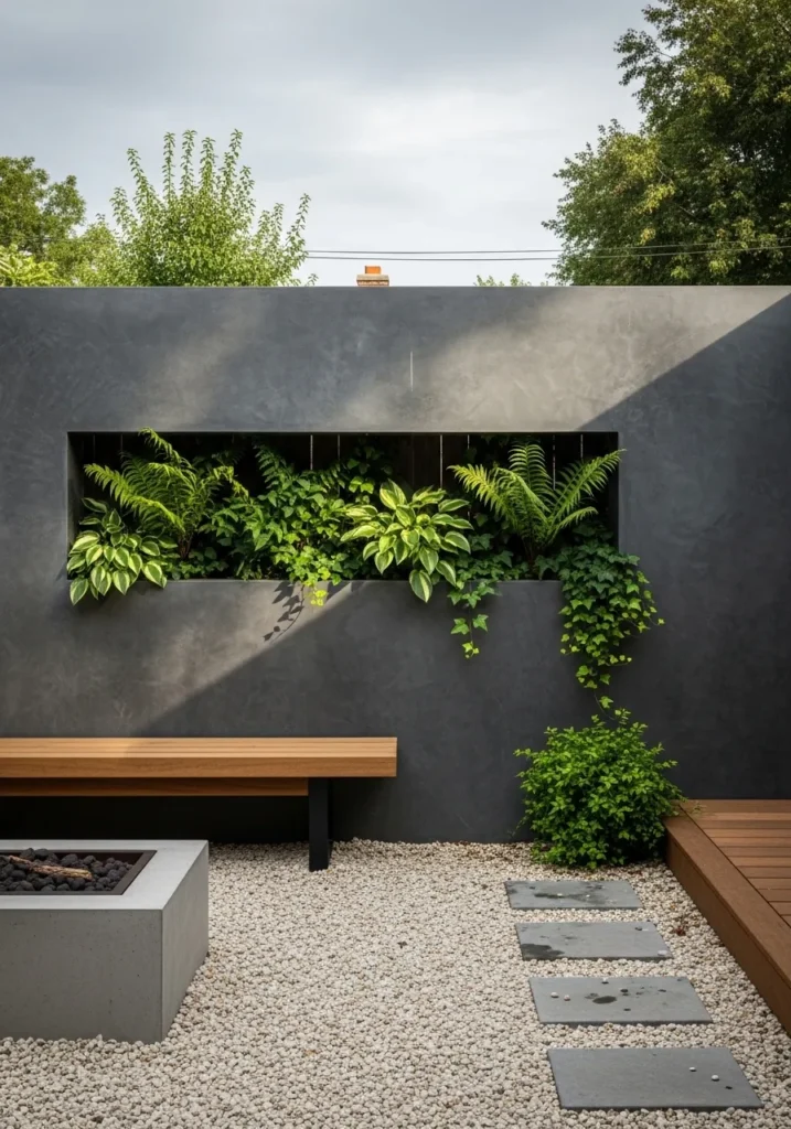 This modern courtyard showcases a deep charcoal privacy wall with a wide recessed niche carved into the center. Inside the opening, lush green plants spill gently over the edge, creating a beautiful contrast against the dark smooth surface. The clean rectangular cutout keeps the look architectural and sharp, while the gravel ground and simple stepping stones add texture below. A slim wooden bench along the side brings warmth and balance to the strong lines.