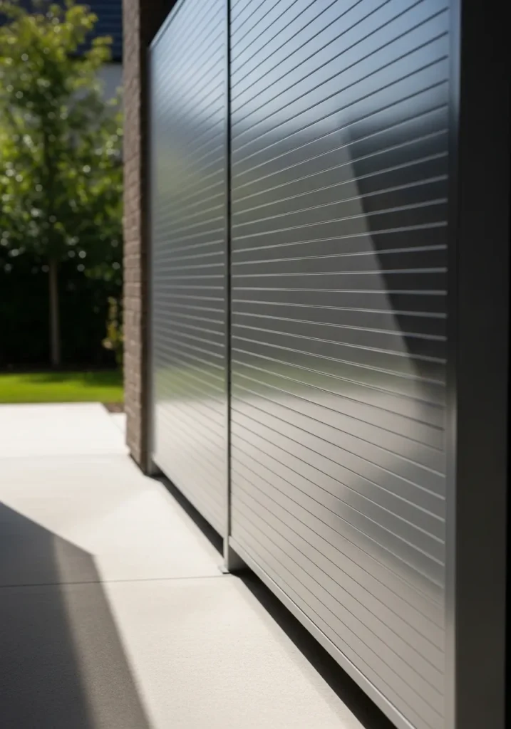 This contemporary privacy wall features large frosted metal panels framed in slim black edges. The surface has a soft translucent quality that allows light to pass through while blocking clear views. The vertical seams create subtle structure and rhythm across the length of the wall. The surrounding greenery and paved walkway highlight the crisp industrial vibe.