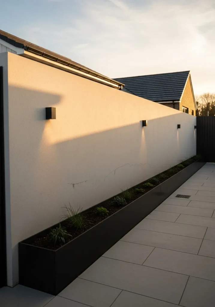 This outdoor walkway is lined with a tall smooth stucco privacy wall in a soft neutral tone. Slim black wall lights are mounted at even intervals, reinforcing the clean horizontal alignment. At the base, a long raised planter filled with greenery runs the entire length, creating a beautiful layered look. The large rectangular pavers on the ground echo the strong linear theme.