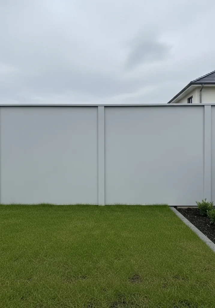 This design showcases a smooth white privacy fence with evenly spaced vertical panels and clean top lines. The wall stands tall behind a simple green lawn, creating a crisp contrast between architecture and landscape. The absence of ornamentation keeps the look pure and modern. Everything feels balanced and uncluttered.