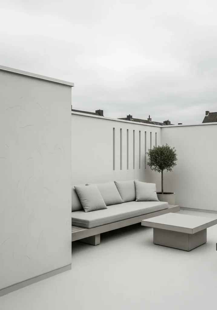 This outdoor lounge is wrapped in a smooth white stucco privacy wall that feels calm and architectural. Along one section, slim vertical cut outs are carved into the surface, adding rhythm and subtle shadow play without interrupting the clean look. The built in bench with thick neutral cushions sits flush against the wall, paired with a low concrete coffee table that mirrors the minimal lines. A single potted tree adds just enough greenery to soften the crisp geometry.