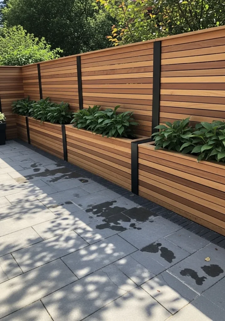 This privacy wall combines horizontal wood slats with integrated planter boxes for a layered and modern look. The warm wood tone contrasts beautifully with dark vertical supports, giving the structure a graphic and balanced feel. Lush green plants spill gently from the built in planters, bringing life and softness to the straight lines. The clean paved walkway in front keeps everything looking organized and intentional.