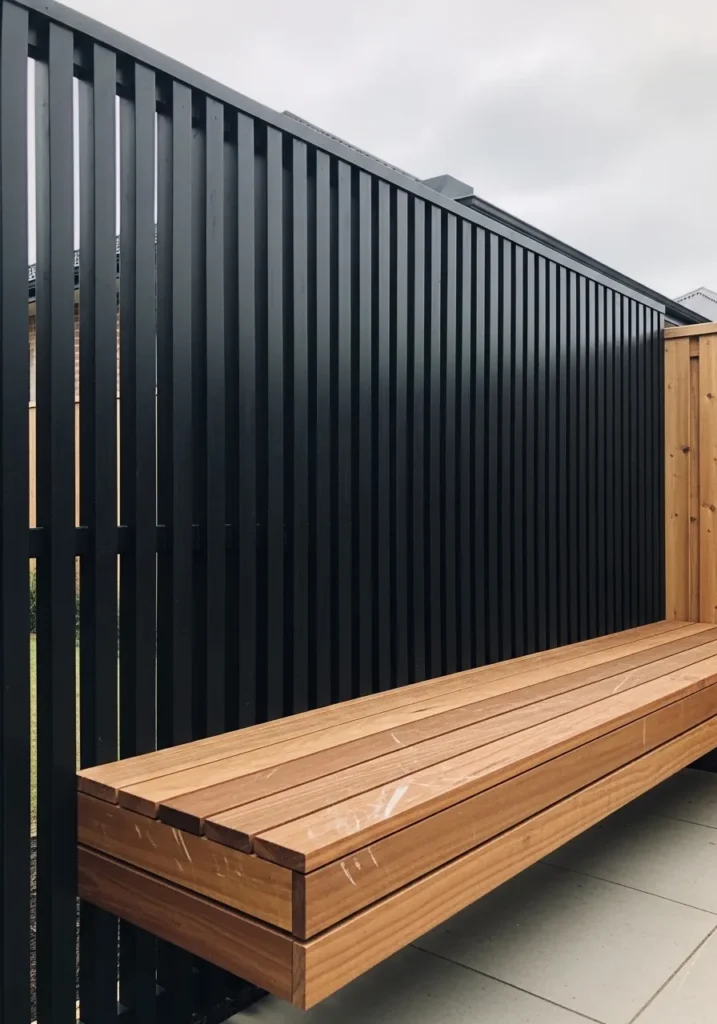 Matte Black Vertical Metal Privacy Screen With Floating Bench