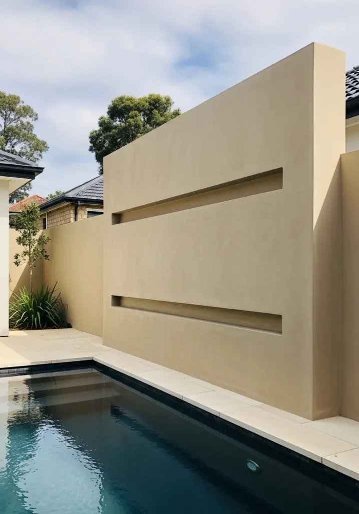 This modern backyard showcases a smooth beige privacy wall with long horizontal cut outs that add subtle dimension. The surface is clean and seamless, emphasizing strong geometric lines. The wall acts as a backdrop for a small pool, reflecting softly in the water and enhancing the sense of calm. The neutral color palette keeps everything cohesive and sophisticated.