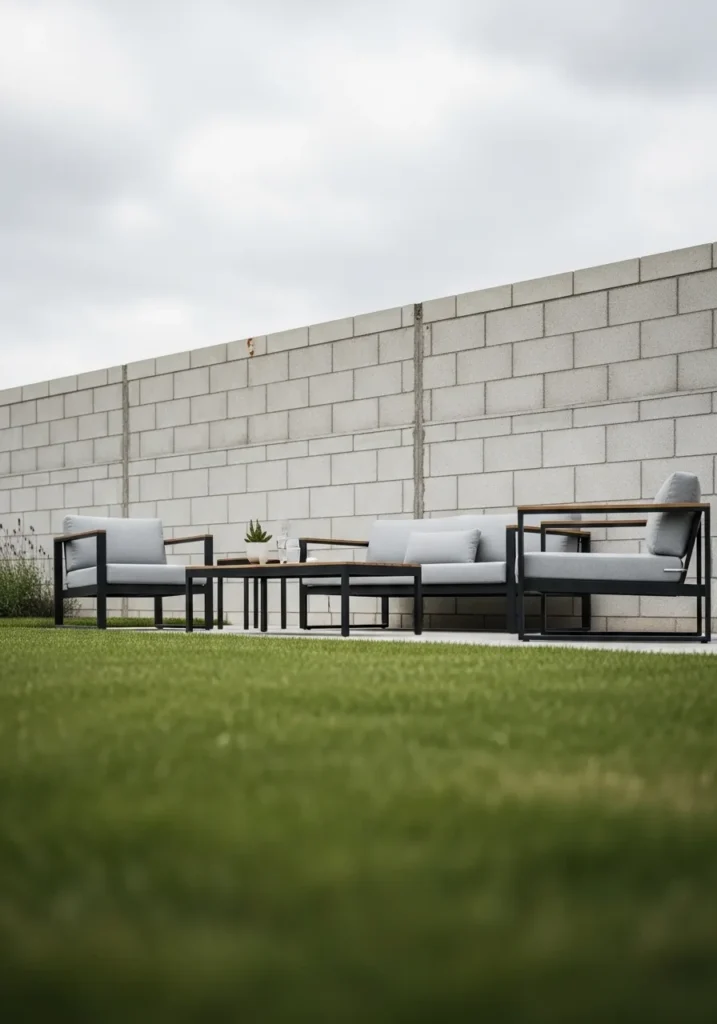 This backyard design features a long concrete block privacy wall in a soft gray tone. The blocks are laid in neat horizontal rows, emphasizing the linear structure and giving the wall subtle texture. In front of it sits a simple arrangement of low outdoor seating and a modern coffee table placed on a manicured lawn. The open sky above keeps the space feeling airy despite the solid wall.