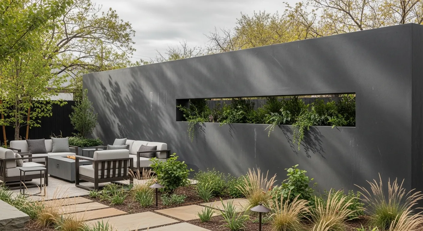 I love how this design feels structured but still welcoming. The contrast between the dark wall and the warm light is so satisfying to me. It feels like a little designer patio tucked away from the world. For anyone who appreciates clean lines and a quiet color palette, this kind of wall makes the entire outdoor space look elevated and thoughtfully styled.