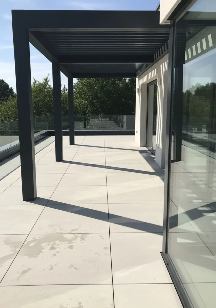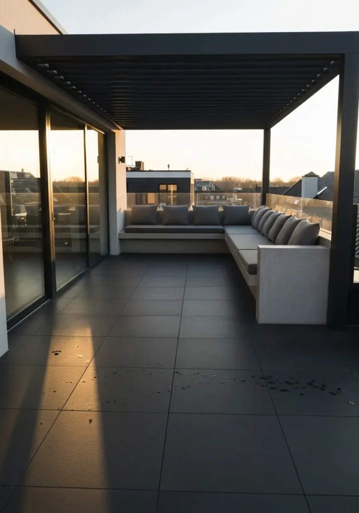 This terrace features oversized matte black porcelain tiles that stretch seamlessly beneath a sleek black metal pergola. The space is styled with low profile outdoor seating in neutral tones, and the clean lines of the sliding glass doors reflect the surrounding neighborhood. The tiles have a subtle texture that softens the dark finish, while the open pergola structure adds architectural depth without overwhelming the space.