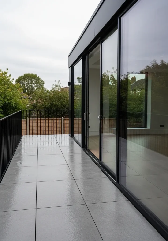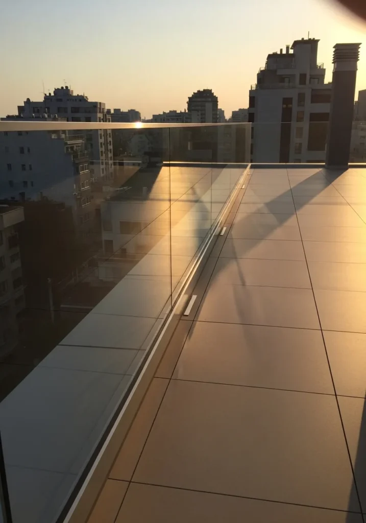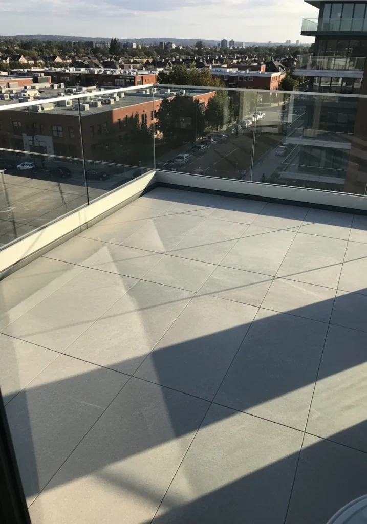 This rooftop terrace features pale gray porcelain slabs bordered by a frameless glass balustrade. The smooth tiles catch the light and reflect the surrounding skyline, while the transparent railing keeps the view open and uninterrupted. The minimal detailing allows the materials to shine.