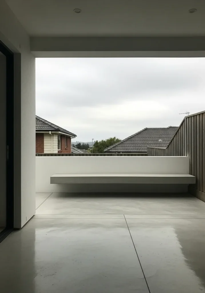 A covered terrace space showcases polished concrete flooring in a light gray shade. The smooth finish reflects the overcast sky, while the open rectangular cutout frames neighboring rooftops. Clean white walls enhance the simplicity of the sleek material.