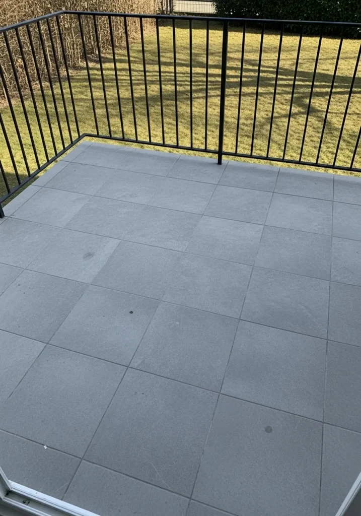 This terrace features large square light gray porcelain tiles laid in a clean grid pattern, framed by a slim black metal railing that wraps around the edge. The matte finish of the tiles keeps the surface soft and modern, while the simple vertical balusters add structure without blocking the view of the grassy yard below. The layout feels open and uncluttered, with crisp lines that highlight the sleek material choice.